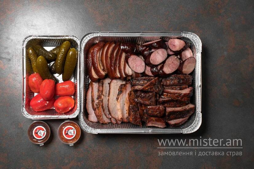 Бочок, ленти ребер, ковбаска, балик соуси аджика та барбекю та асорті соління.