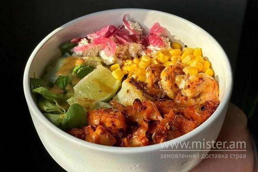 Креветки гриль подаємо з кіноа, печеним бататом, кукурудзою, сиром фета, салатом айсберг, шпинатом і маринованою цибулею. Заправляємо боул соусом теріякі та майо.