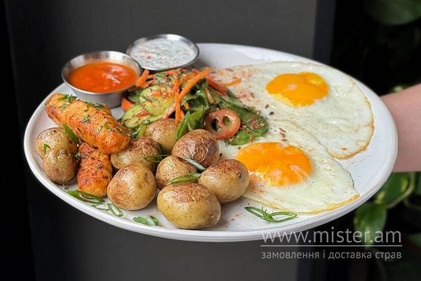 Оновлена класика: курячий кебаб власного виробництва, картопелька, яєшня з двох яєць та овочевий салат. Подаємо з соусами дзадзикі та томатним.