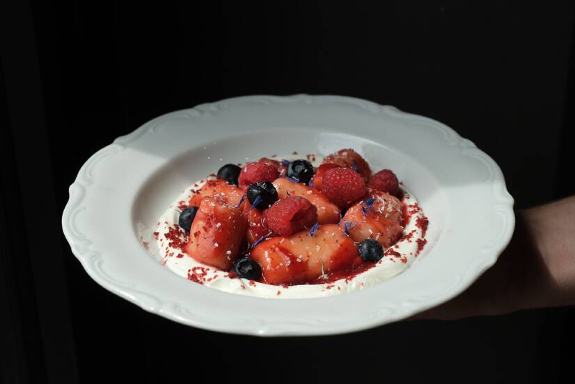 Ніжні ліниві вареники з солодкого творогу, подаються з густим грецьким йогуртом і яскравим соусом із сезонних ягід. Смачна класика в легкому літньому виконанні — ідеально для сніданку чи десерту.