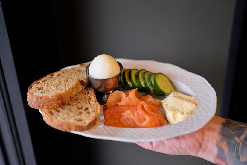 Мультизерновий хліб із збитим вершковим маслом, слабосолений лосось, огірок з гірчично-медовим соусом та яйце .