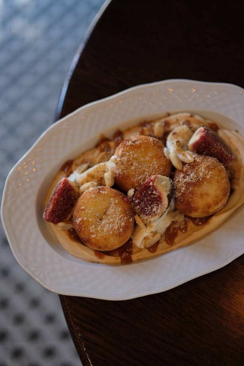 Три ніжні сирники, обсмажені до золотистої скоринки, подані на подушці крему «3 молока». Декоровані свіжою сливою, смужками солоної карамелі та смаженим арахісом, з порційним йогуртом. Вишуканий сніданок з балансом солодкого та горіхового хруску.