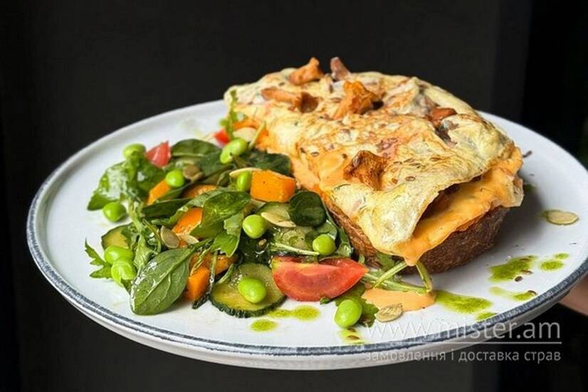 Омлет подаємо на мультизерновому хлібі, який змащуємо морквяним мусом. Зелений салат заправляємо соусом песто.