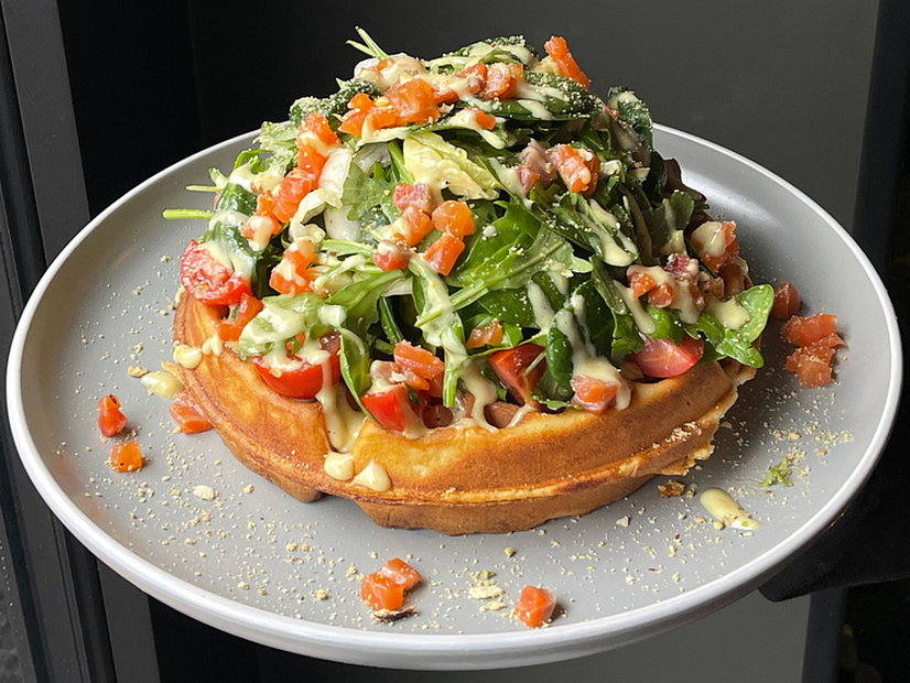 Бельгійська вафля з слабосоленим лососем, додаємо багато зелені, томати та соус цезар