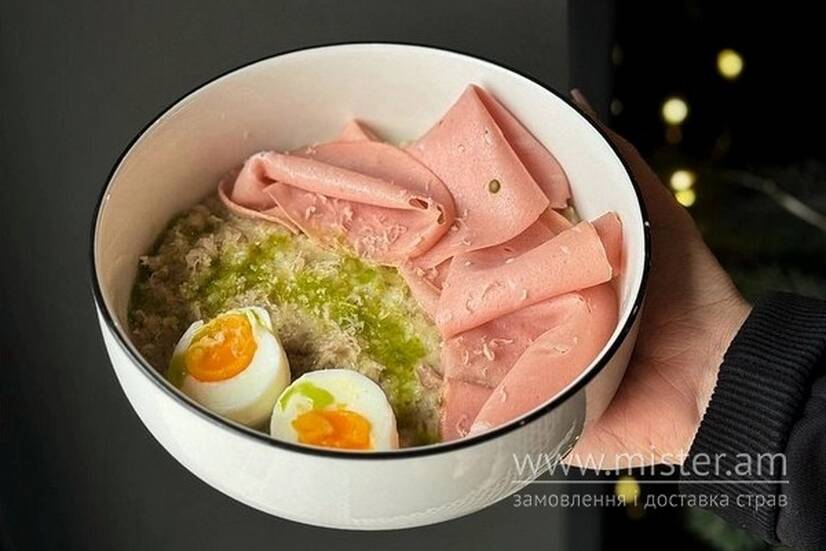 Вівсянку подаємо з мортаделою, пармезаном, соусом бешамель та яйцем.