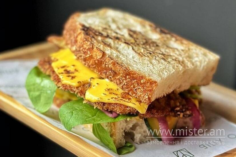Пшеничний хліб, хрусткий курячий шніцель, чеддер, шпинат, соус цезар, огірки пікулі та маринована синя цибуля та синя капуста.