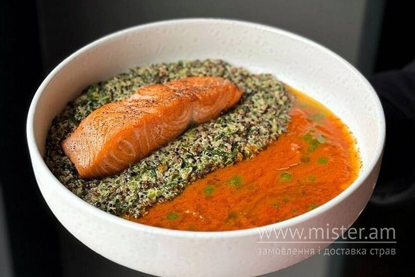 Поєднання філе лосося з міксом кіноа, соусом на основі томатів пелаті з додаванням шпинату та зеленої олії.