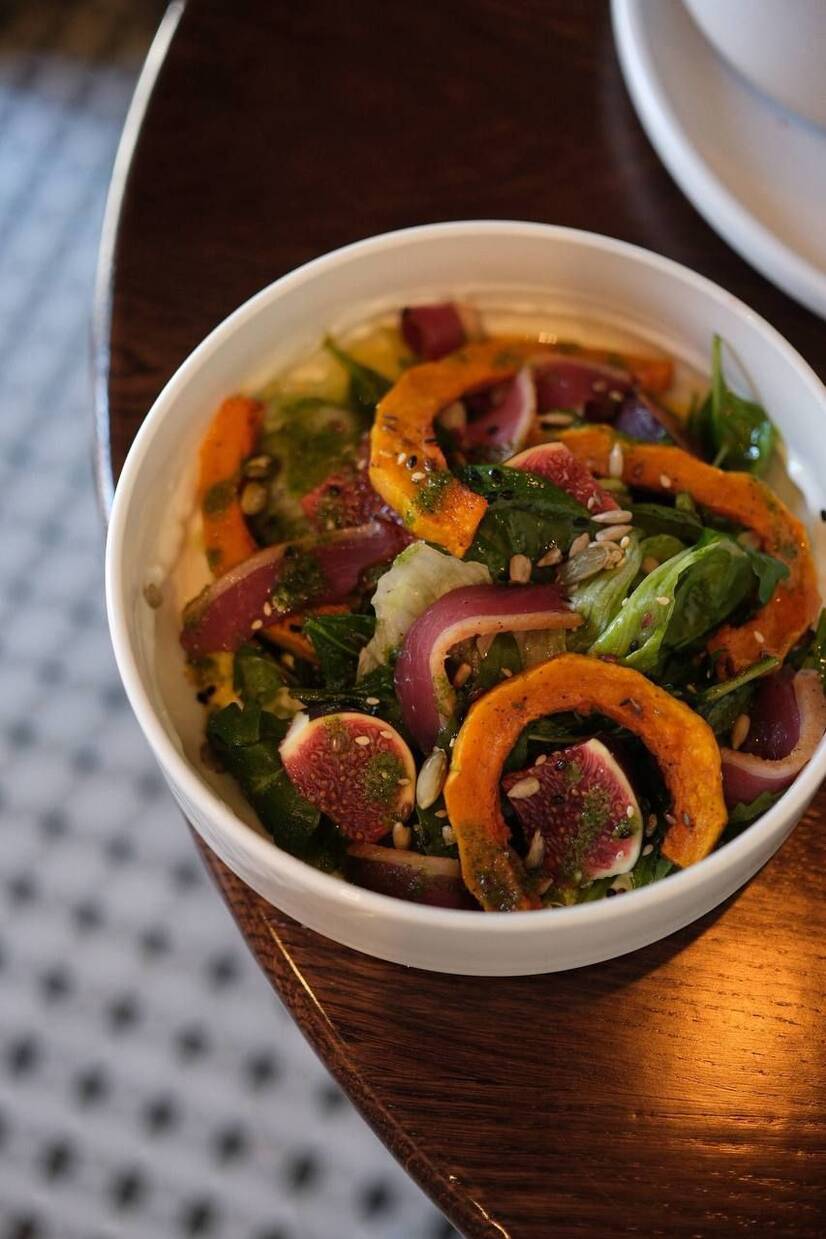 Салат із в’яленого качиного філе, міксом зелені (айсберг, рукола, шпинат), довгими шматочками печеного гарбуза, свіжою сливою та насінням гарбуза, соняшника і льону. Приправлений чилі-олією та соусом песто. Легкий, збалансований салат з гармонією солодкого та солоного.