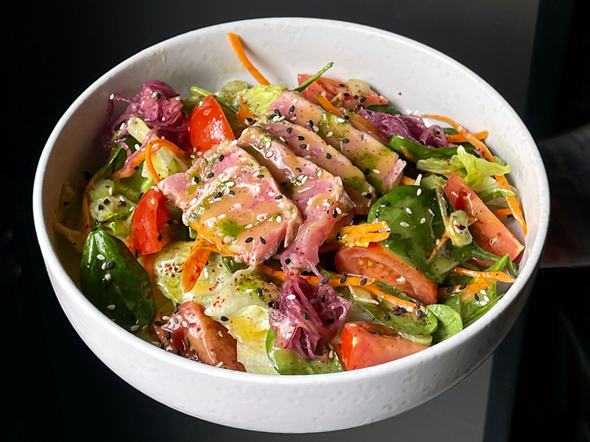 Соковитий тунець на грилі, айсберг та шпинат з додаванням моркви та селери і томатів чері. Заправляємо медово-гірчичним соусом.