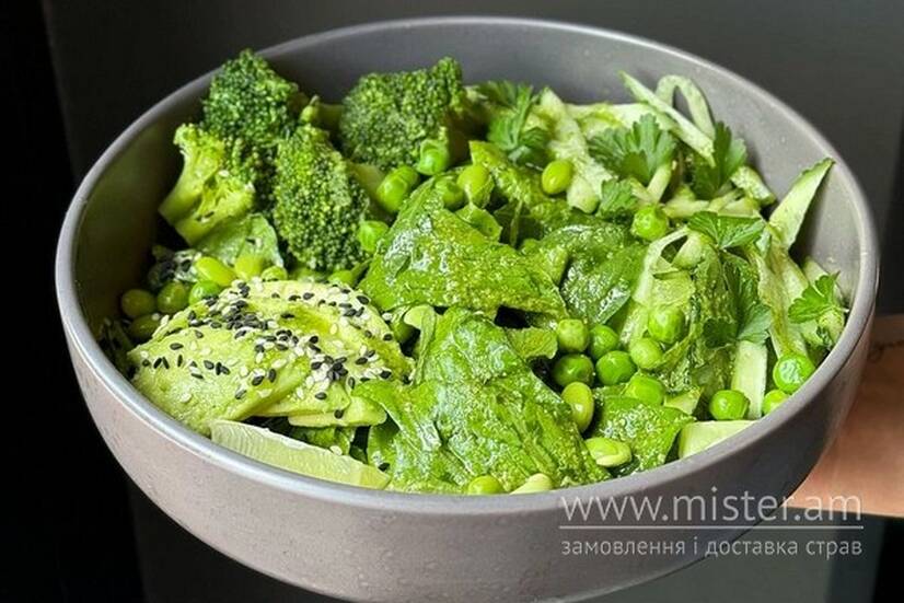 Супер хелсі: шпинат, рукола, айсберг, авокадо, огірок, горошок та боби едамаме. Заправляємо соусом песто.