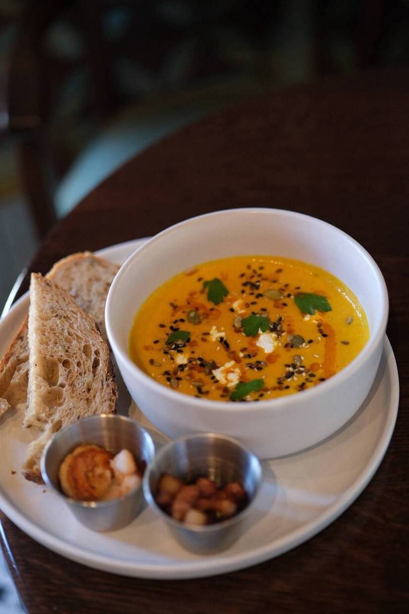 Гарбузовий крем-суп з вершками та фетою, прикрашений міксом насіння гарбуза, соняшника та льону, з невеликою краплею чилі-олії. Легка вершкова текстура, ніжний смак гарбуза та легка гостринка.