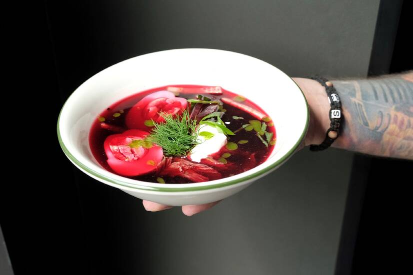 Традиційна українська страва в сучасному виконанні. Буряковий відвар, свіжий огірок, ніжна яловичина, буряк, грецький йогурт і пікантна шрірача — освіжаючий смак з легким гострим акцентом. Подається з житнім хлібом