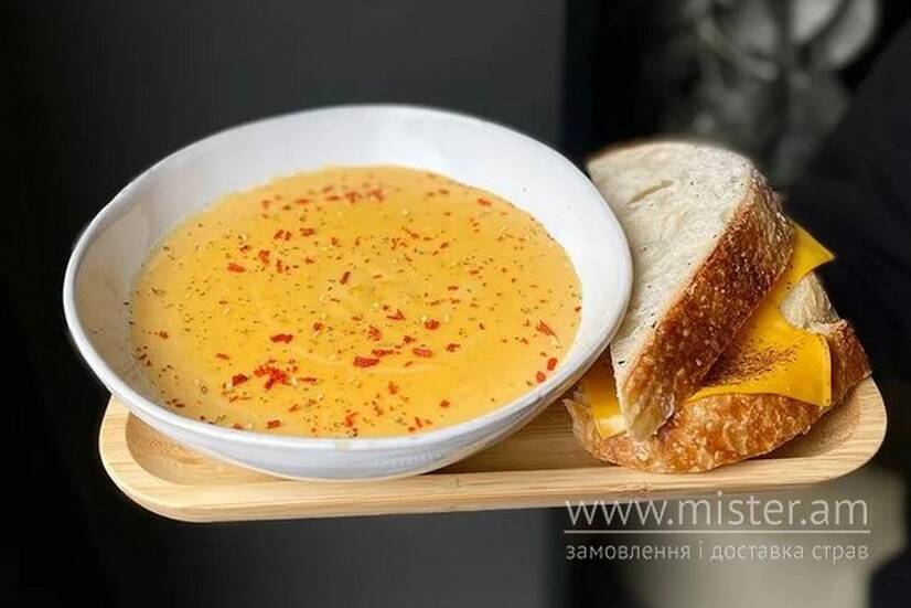Ніжний та ситний крем суп, з чеддером, пармезаном та овочами. Подаємо з пшеничним хлібом власного виробництва.
