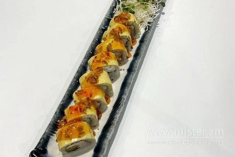 Креветка, сир вершковий, сир тостовий, апельсин, цибуля кранч, чипси з локшини, соус світ чилі.