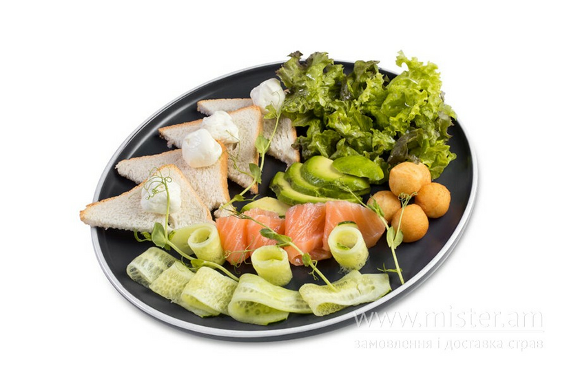 Тостовий хліб, сир вершковий, авокадо, картопляні крокети, лосось солений, огірок, мікс салатів.