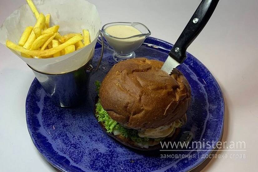 Булочка, соус айолі, соус чилі, котлета яловича, сир тостовий, помідор, лист салату, огірок маринований, цибуля маринована, картопля фрі, соус сирний.