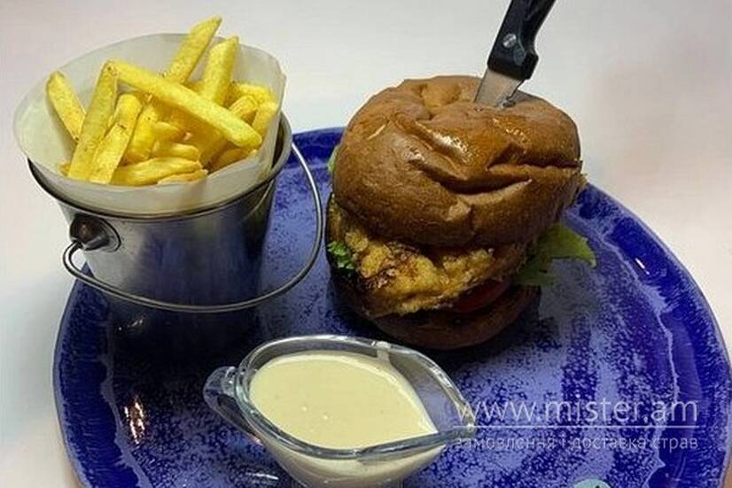 Булочка, соус медово-гірчичний, куряче бедро фрі, лист салату, помідор, огірок маринований, картопля фрі, соус сирний.