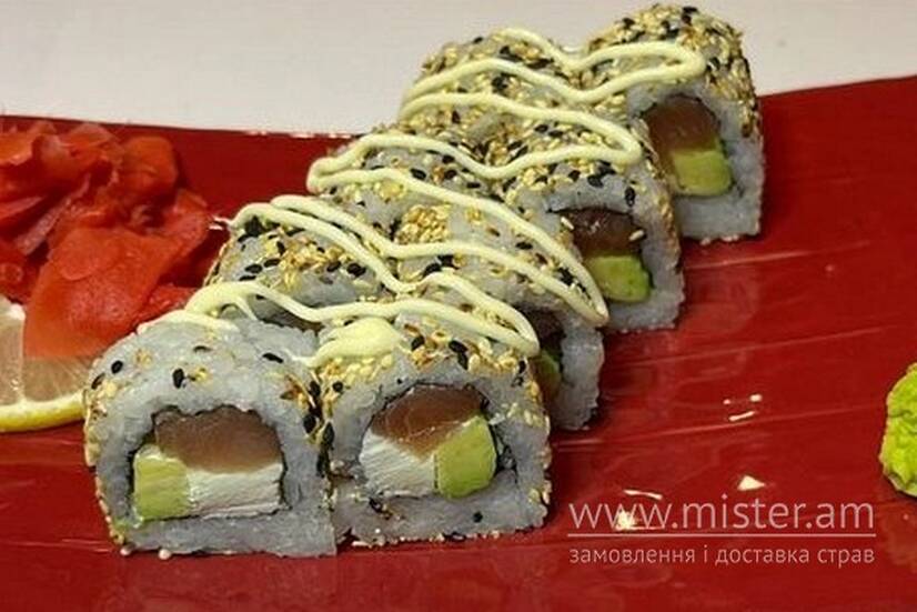 Лосось, сир вершковий, майонез гострий, авокадо, кунжут.
