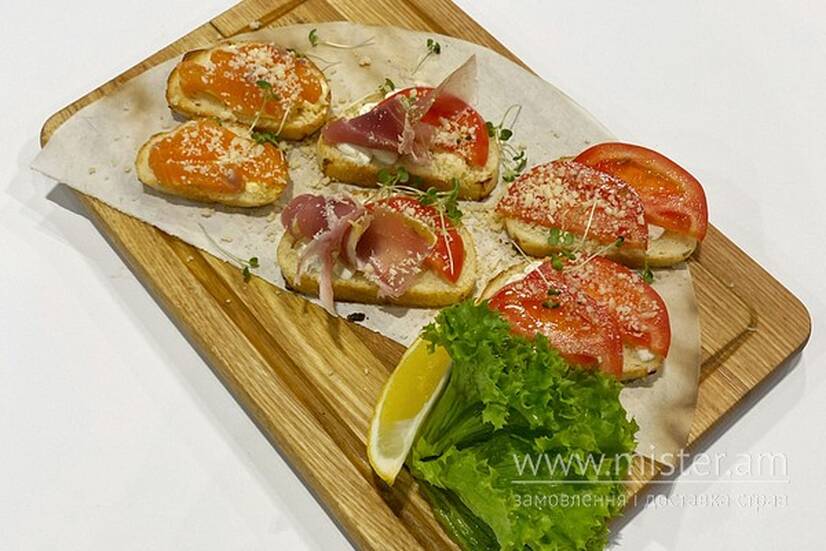 Грінки, помідор, лосось, прошуто, пармезан, лимон.