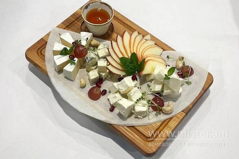 Камамбер, моцарела, фета, горгонзола, горіхи, виноград, яблуко, мед.
