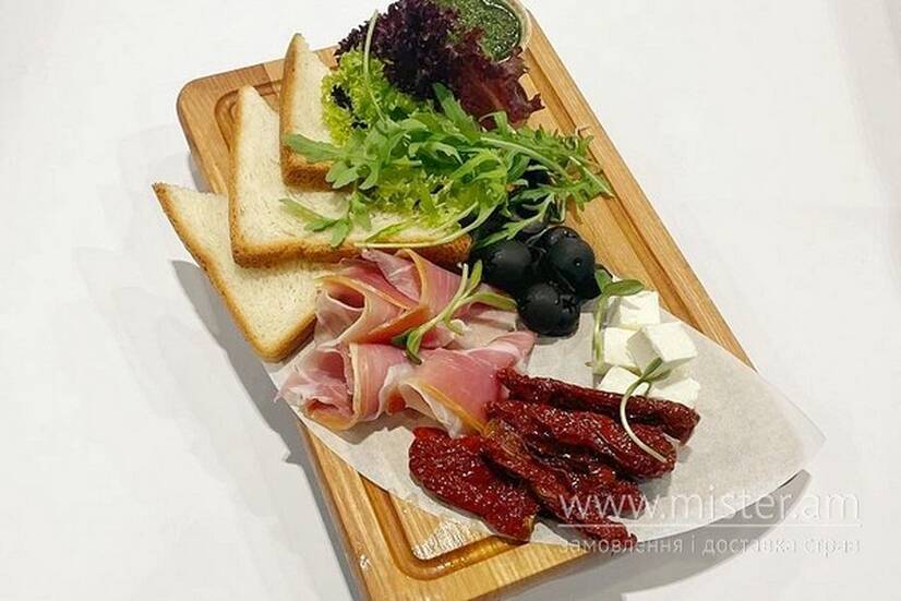 Хліб тостовий, прошуто, в’ялені томати, фета, маслини, мікс салатів, соус песто, зелень.