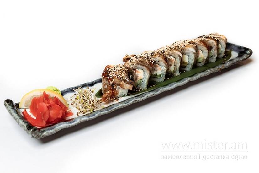 Вугор, сир вершковий, апельсин, соус унагі, цибуля кранч.