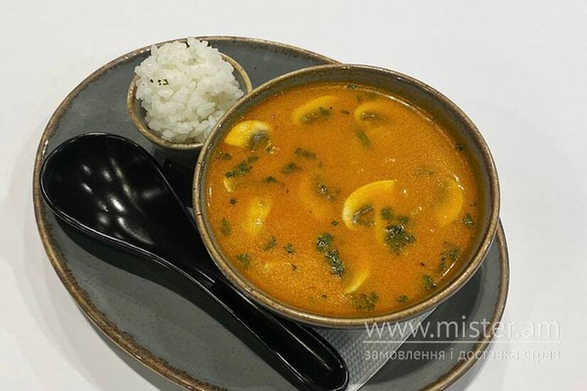 Паста том ям, печериці, кокосове молоко, лимонний сік, рис паровий, кінза.