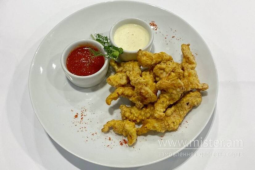 Куряче філе в клярі, соус барбекю, соус сирний.