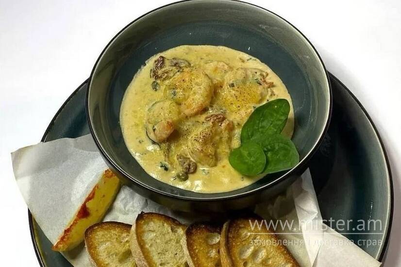 креветка тигрова, шпинат свіжий, каперси, томати в`ялені, вершковий соус, сир пармезан, лимон, чіабата.