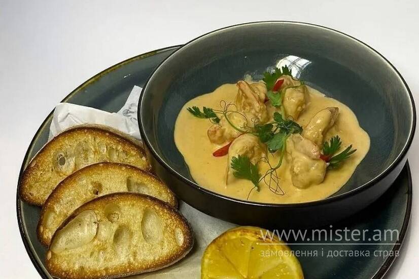 Креветка тигрова, вершковий соус, тайський соус, кінза, перець чилі, чіабата, лимон.