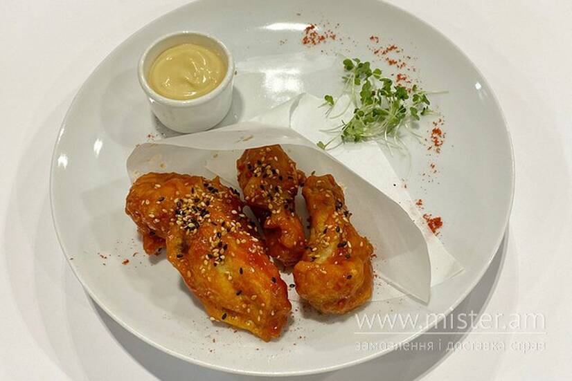 Крильця у гострому соусі з соусом айолі.