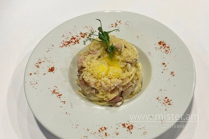 Спагеті, вершки, жовтки перепелиного яйця, бекон, пармезан.