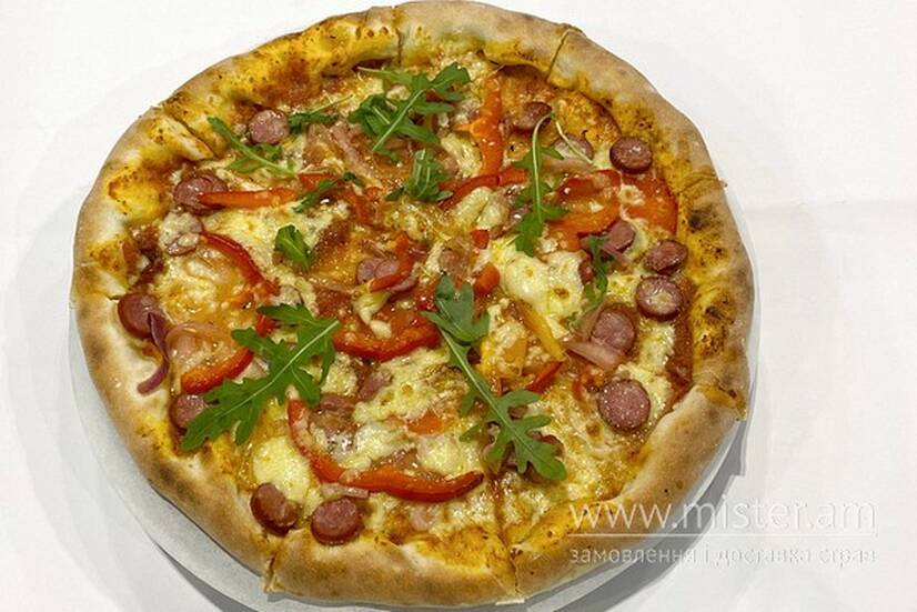 Тісто, соус фірмовий, моцарела, мислівські ковбаски, перець болгарський, цибуля маринована, рукола.
