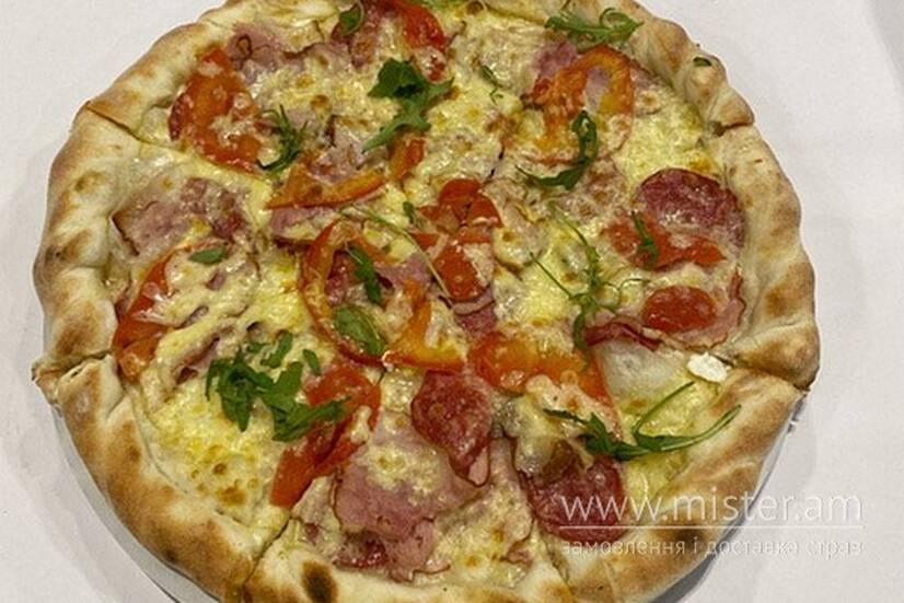 Тісто, соус вершковий, моцарела, бекон, шинка, салямі, помідор, рукола.