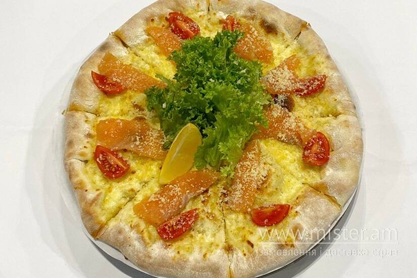 Тісто, соус вершковий, моцарела, лосось слабосолений, мікс салату, пармезан, помідор чері, лимон.