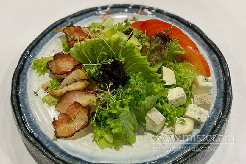 Куряче філе, бекон, помідор, авокадо, мікс салатів, сир горгонзола, салатна заправка.