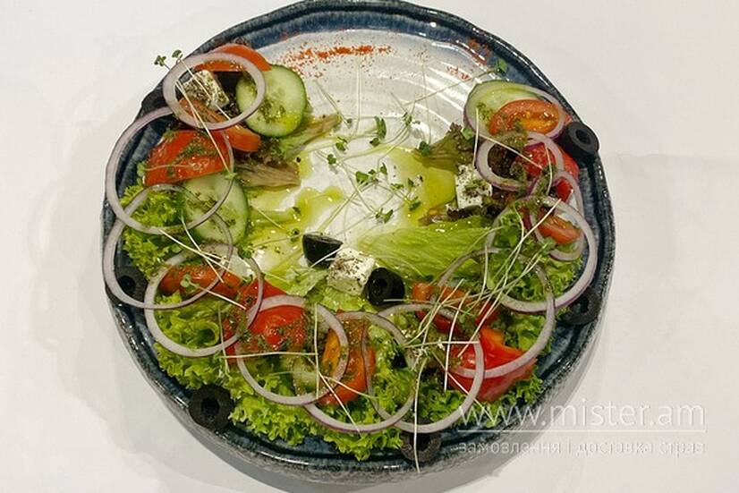 Мікс салатів, огірок, помідор, перець болгарський, маслини, цибуля синя, фета, соус песто, олія оливкова, лимонний сік.