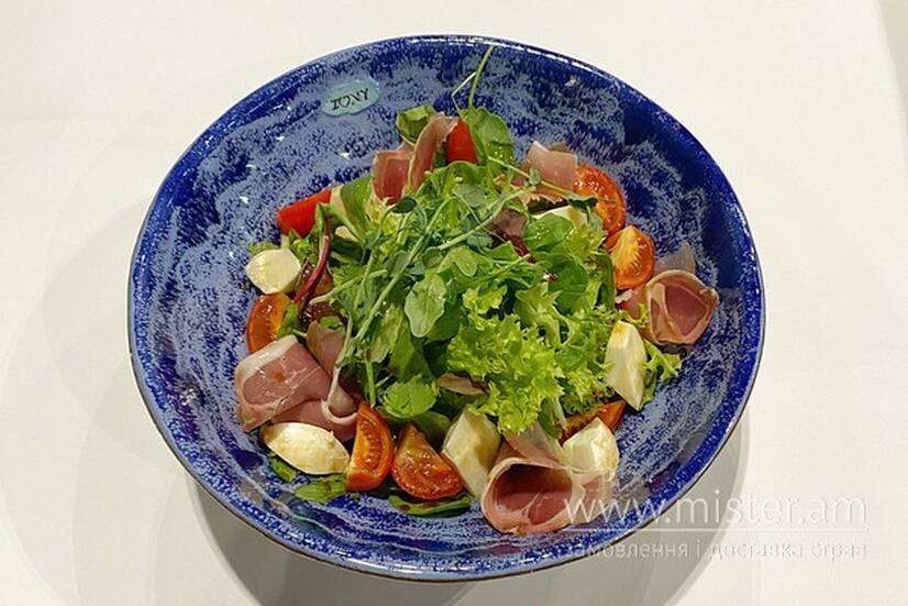 Мікс салату, руккола, моцарелла в розсолі, чері, прошуто, олія оливкова, соус соєвий.
