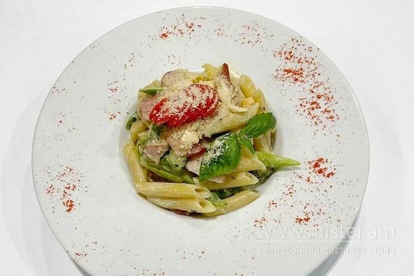 Пене, спаржа, бекон, біле вино, часник, базилік, вершки, кеш'ю, пармезан, чері.