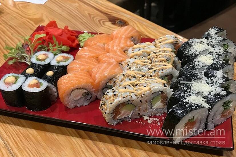 Філадельфія з лососем, Каліфорнія з лососем, футомакі з огірком та лососем, хосомакі з лососем.