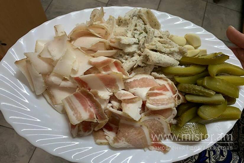 Сало солене, бочок солений, сало мелене з часником, огірок солений, цибуля салатна, часник..