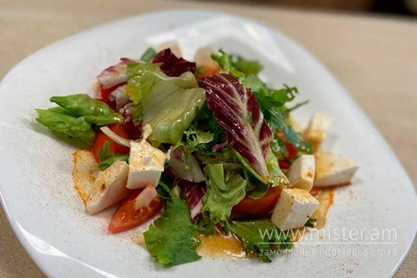 Листя салату, томати чері, огірок, перець болгарський, сир моцарела, олія оливкова.
