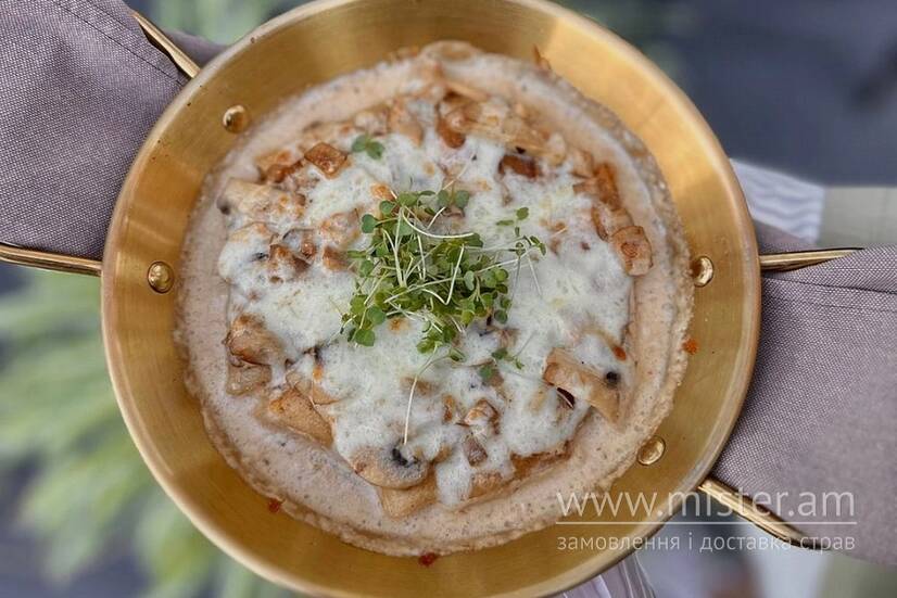 Запечені налисники з м`ясом, грибним соусом та сиром