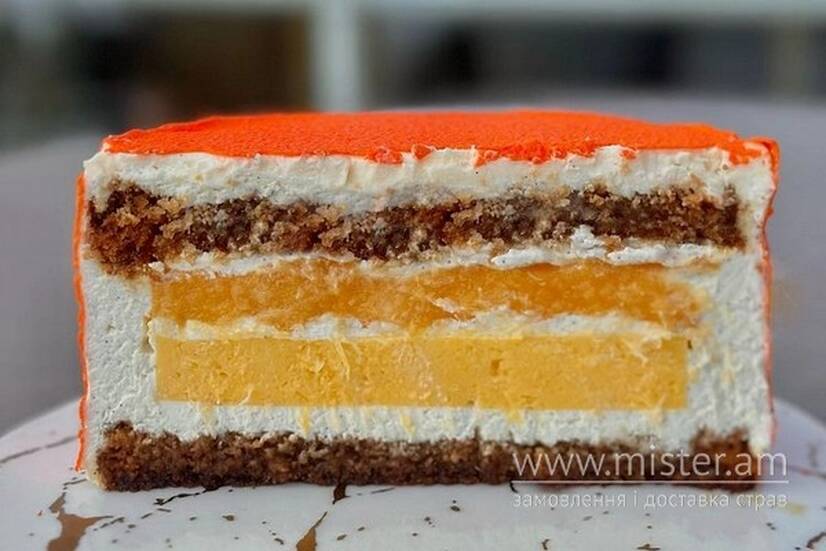 Медовий бісквіт, мандариновий курд, мандаринове кюлі та крем чіз.