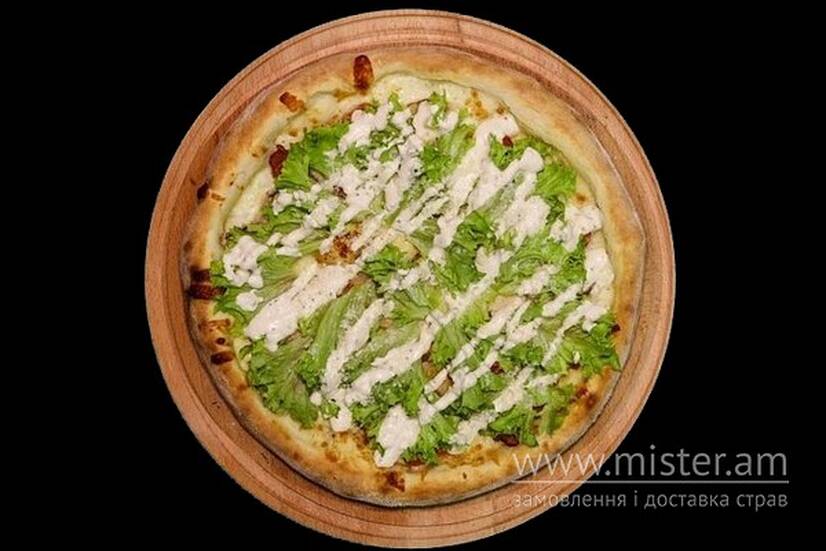 Соус вершковий, соус Цезар, моцарела, грудинка, курка копчена, чері, листя салату, пармезан.