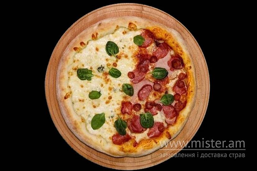 Соус томатний, соус вершковий, моцарела, дорблю, маздамер, шинка, салямі італійська, мисливські, базилік.