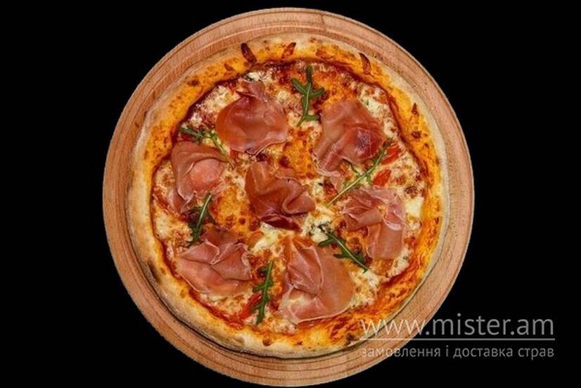Соус томатний, моцарела, дорблю, прошуто, чері, базилік.