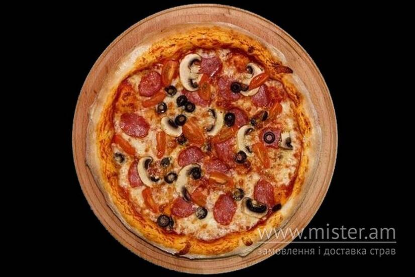 Соус томатний, соус BBQ, салямі італійська, печериці, оливки, чері, базилік.