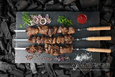 Вирізка яловичини, смажена на деревному + мариновані зелень та цибуля.