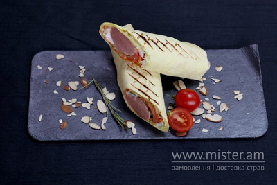 Молочна сосиска, помідор, огірок, капуста, морква по-корейськи, соуси.